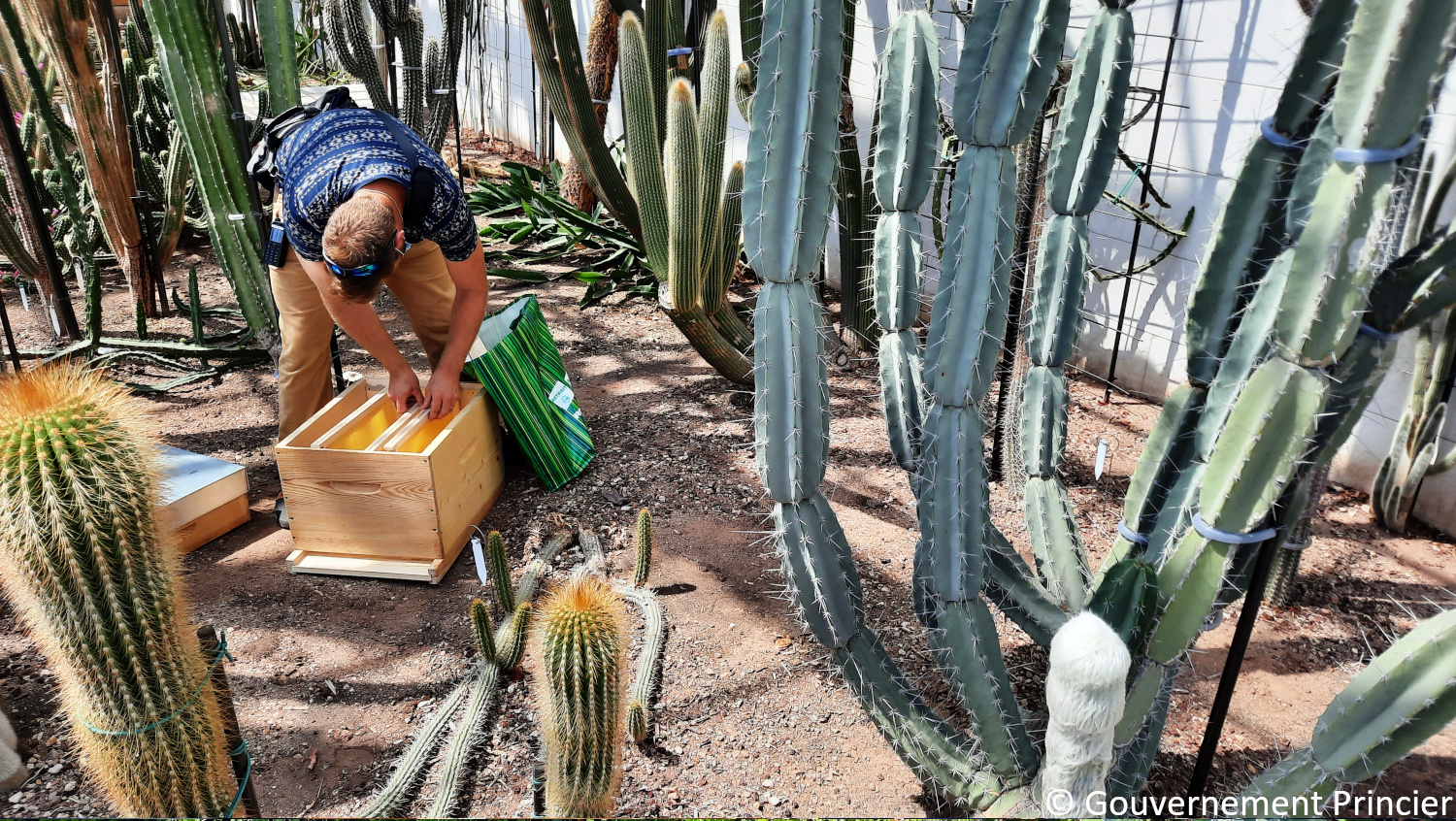 M. Lucien GUÉRIN, apiculteur référent, conseille l'équipe de professeurs et les jardiniers de la Direction de l'Aménagement Urbain sur l'agencement des cadres et l'équipement des ruches en vue de l'accueil des futurs essaims d'abeilles ! Les repérages au Jardin Exotique de Monaco permettent de définir l'implantation de la future ruche connectée !